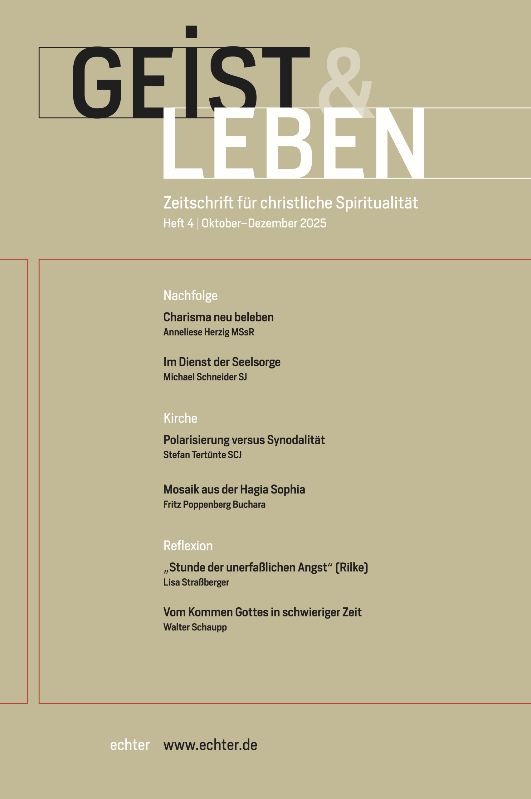 GEIST & LEBEN erscheint viermal pro Jahr zu den Themen Spiritualität & Theologie, Bibel & Ökumene, Gebet & Mystik, Liturgie & Christlicher Lebensstil und Biografien & Literatur.