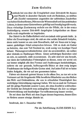 9. Abhandlungen | Alois Ersin Zum Geleite (Innsbruck, den 1. Dezember 1925) [1]