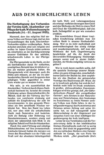 9. Aus dem kirchlichen Leben | Heinrich Bleienstein I. Die Herbsttagung des Verbandes der Vereine kath. Akademiker zur Pflege der kath. Weltanschauung in Innsbruck (14.−21. August 1925) [84−87]
