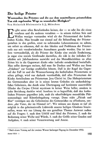 9. Abhandlungen | Heinrich Bleienstein Der heilige Priester. Wesensschau des Priesters und die aus dem unmittelbaren priesterlichen Tun sich ergebenden Wege zu wesenhafter Heiligkeit [193−211]