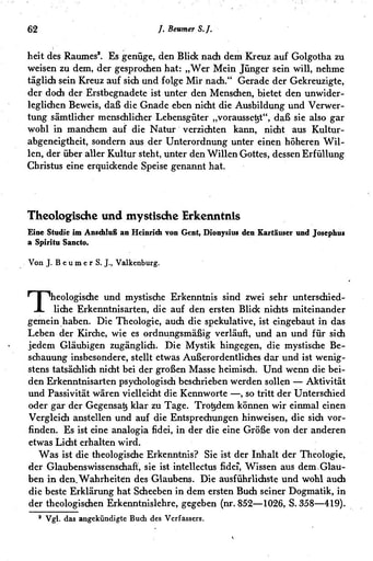 9. Abhandlungen | J. Beumer Theologische und mystische Erkenntnis. Eine Studie im Anschluß an Heinrich von Gent, Dionysius den Kartäuser und Josephus a Spiritu Sancto [62−78]