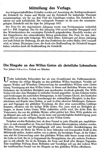 „Aus kriegswirtschaftlichen Gründen wurde auf Anweisung der Reichspressekammer die Zeitschrift für Aszese und Mystik und die Zeitschrift für katholische Theologie zusammengelegt, wie Sie aus dem Titel des Umschlages ersehen. Die Zeitschrift erscheint nur noch halbjährlich. Die vorliegende Nummer ist die erste der zusammengelegten Zeitschrift und die letzte des Jahrgangs 1943. […]“ [121]